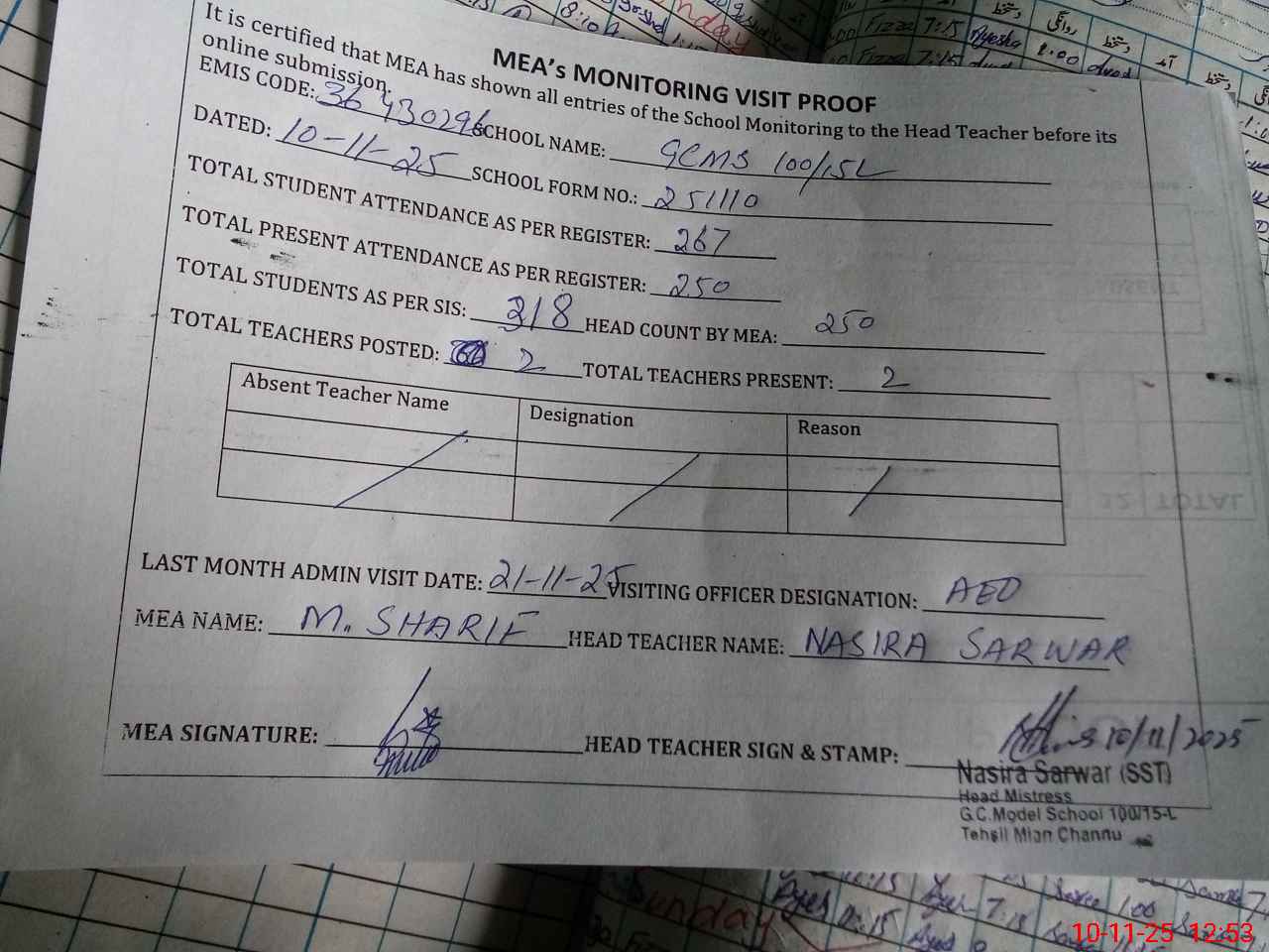 | Attendance Register | Head Teacher | MEA with School | Visit Proof |