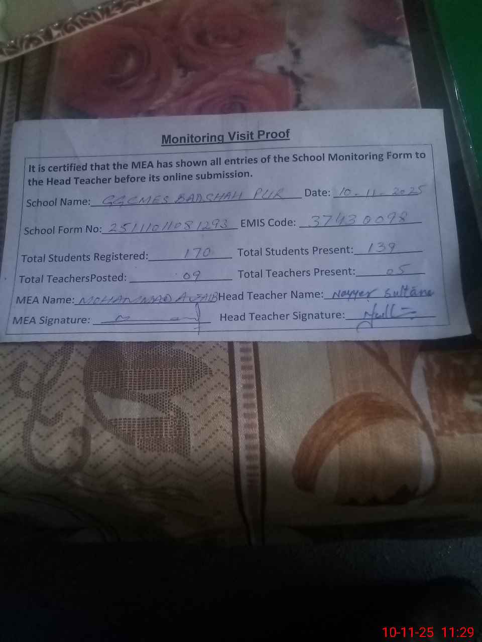 | EMIS Code: 37430098 | Name of School: GGCMES BADSHAH PUR | |||