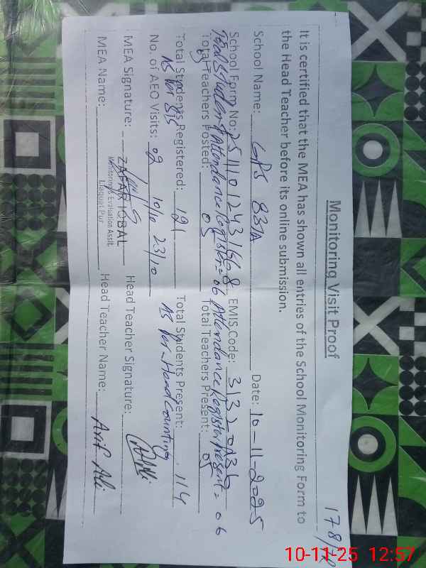 | Attendance Register | Head Teacher | MEA with School | Visit Proof |