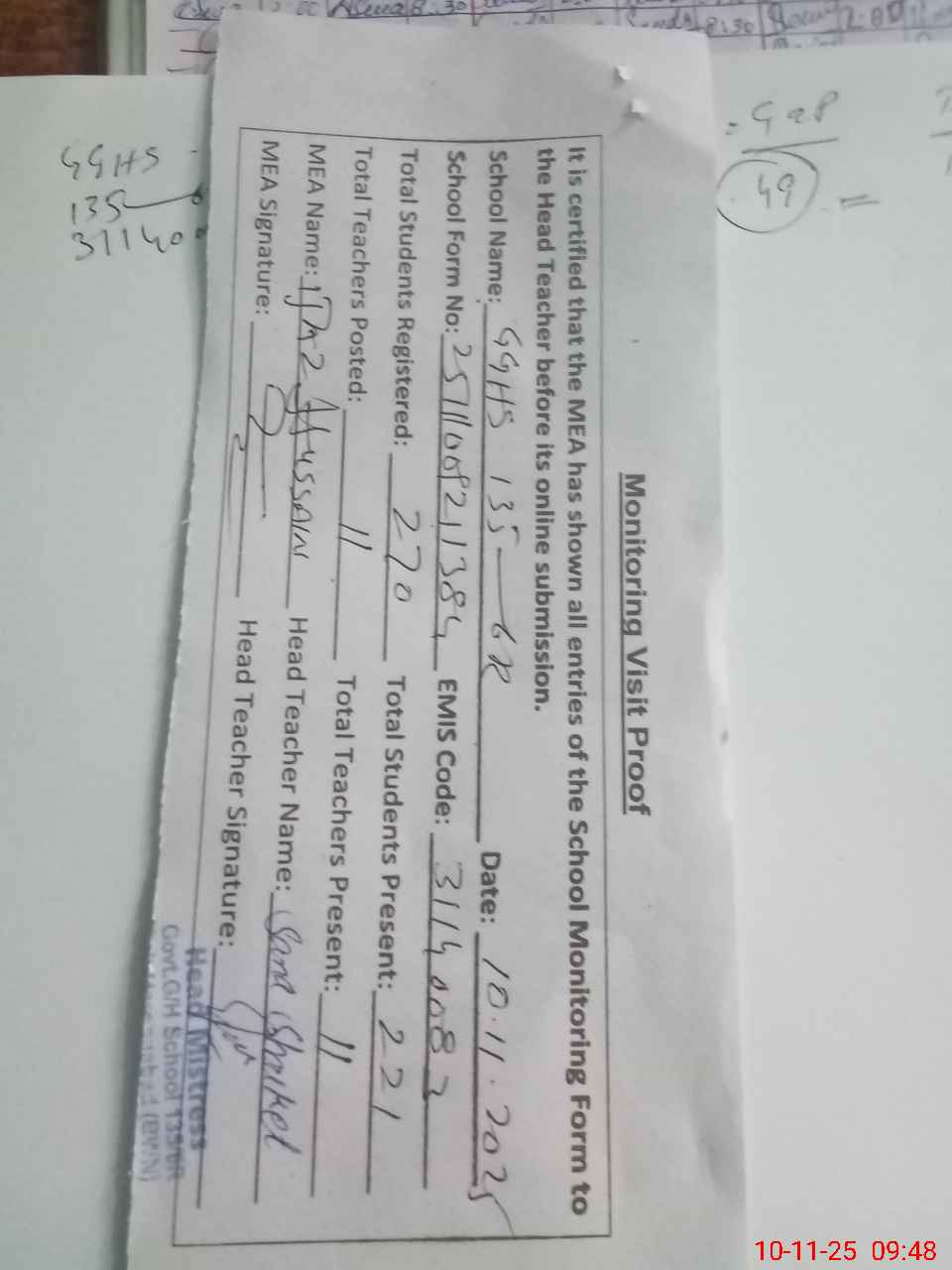 | Attendance Register | Head Teacher | MEA with School | Visit Proof |