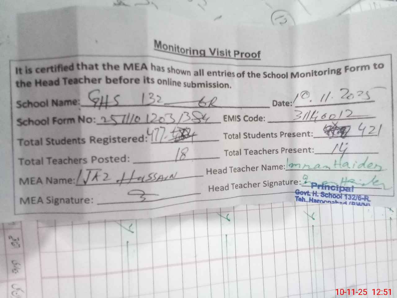 | Attendance Register | Head Teacher | MEA with School | Visit Proof |