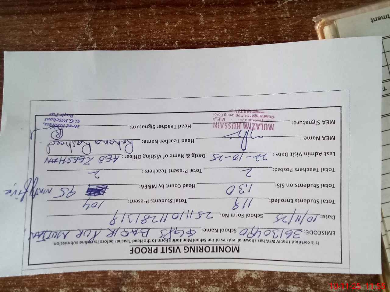 | Attendance Register | Head Teacher | MEA with School | Visit Proof |