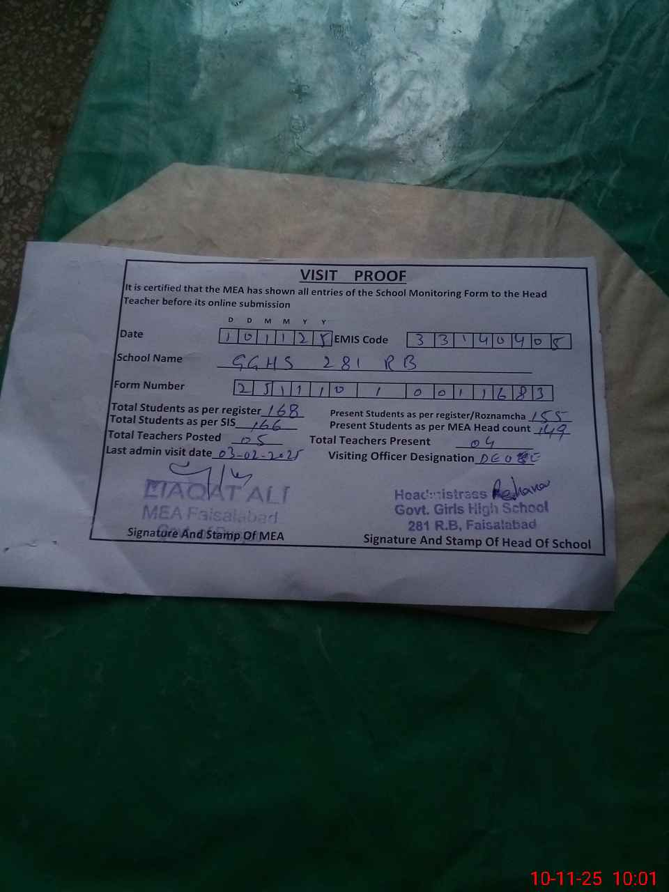 | Attendance Register | Head Teacher | MEA with School | Visit Proof |