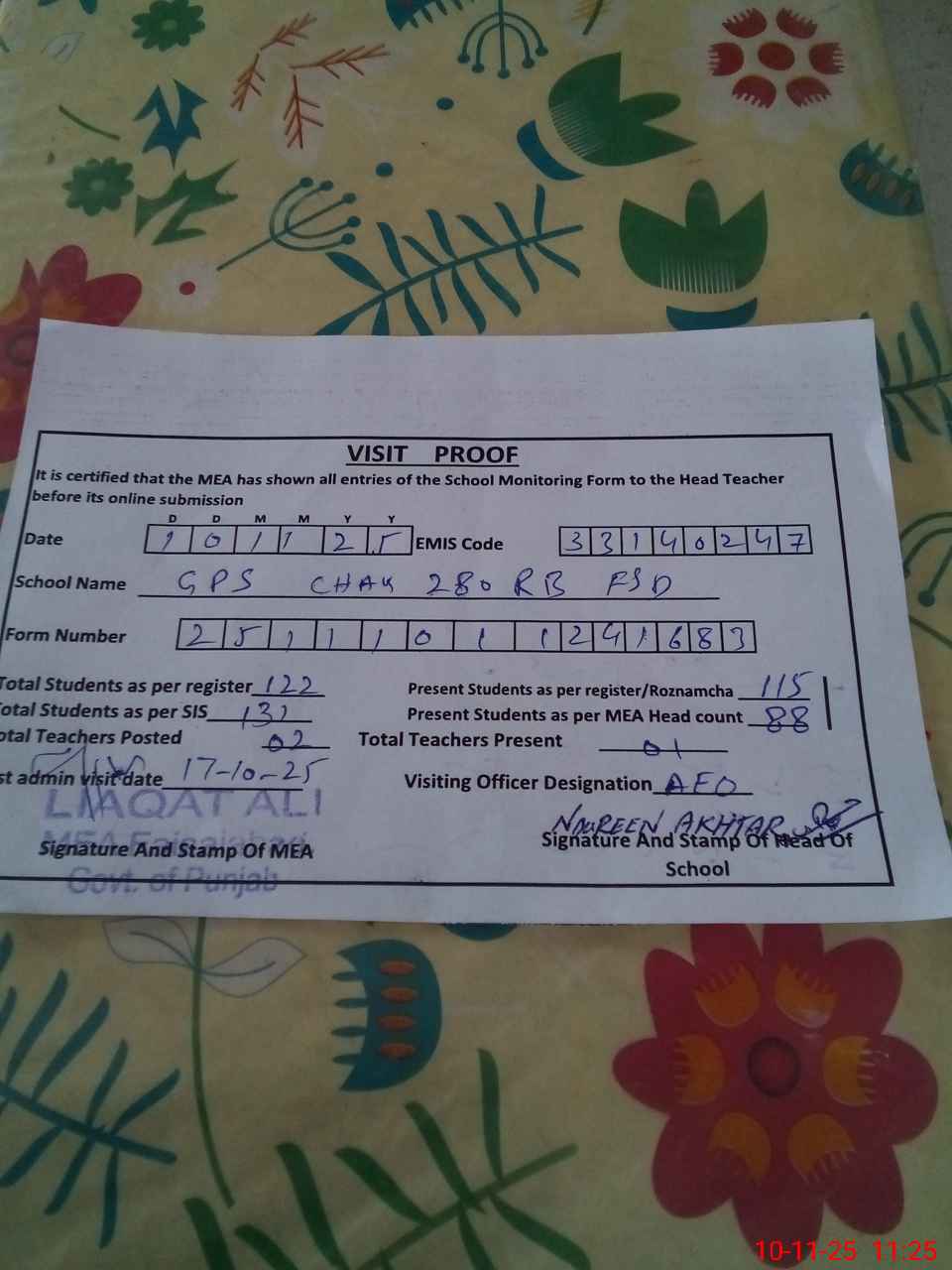| Monitoring Date: 10-11-2025 | Start Time: 10-11-2025 10:54 AM | End Time: 10-11-2025 11:30 AM | Name of MEA: LI**** AL**** | |