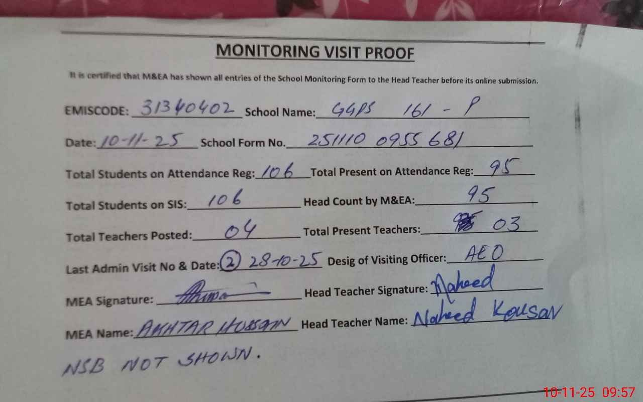 | Monitoring Date: 10-11-2025 | Start Time: 10-11-2025 09:15 AM | End Time: 10-11-2025 09:57 AM | Name of MEA: Ak**** Hu**** Bh**** | |