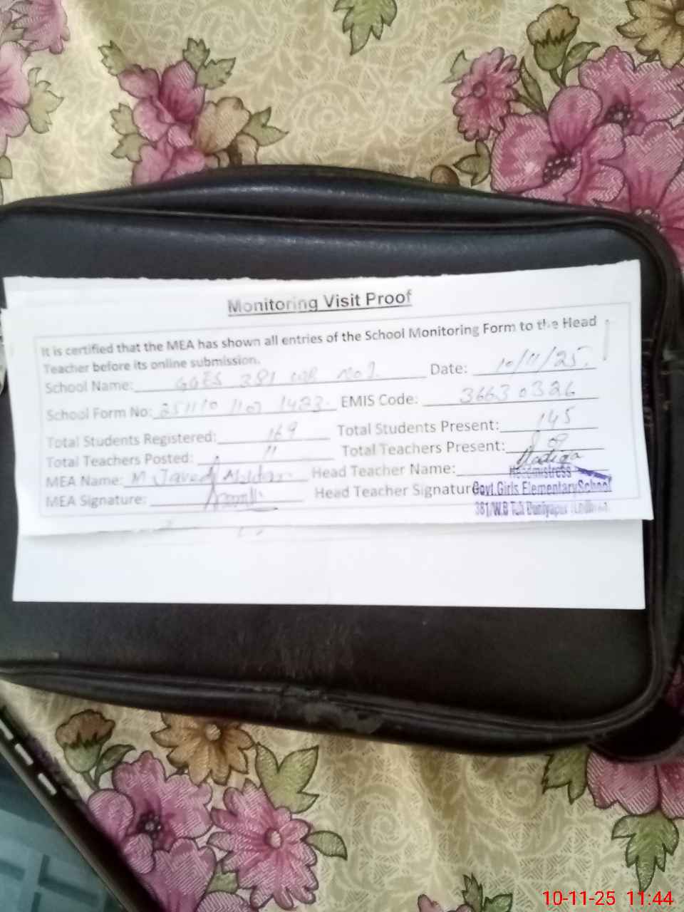 | Monitoring Date: 10-11-2025 | Start Time: 10-11-2025 11:07 AM | End Time: 10-11-2025 11:45 AM | Name of MEA: MU**** JA**** AK**** | |