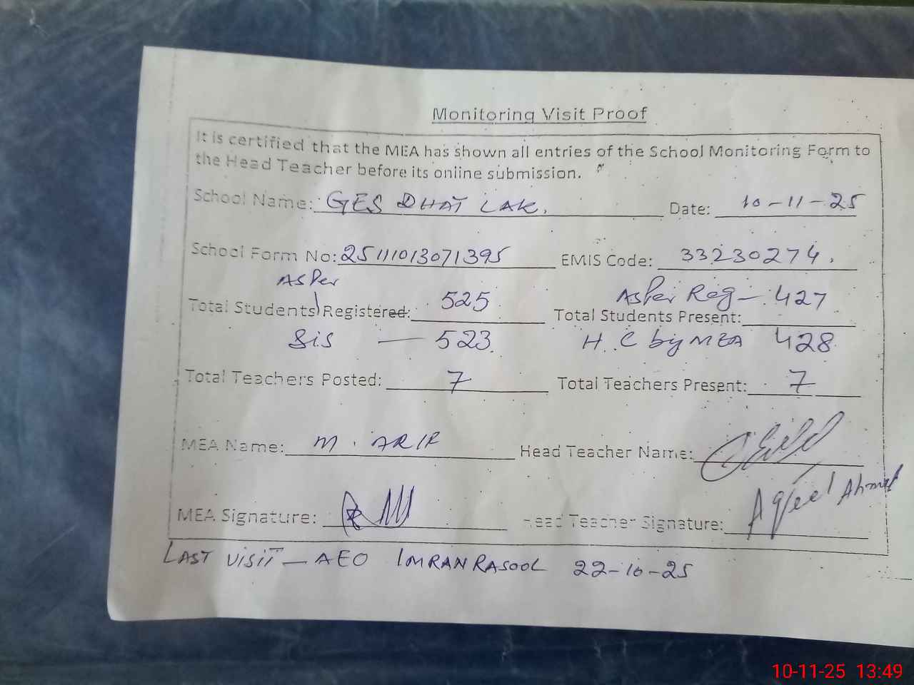 | Certified that this School was Inspected by the Undersigned MEA/DMO Today and the Information Stated Above is as Per Record. | |||||
