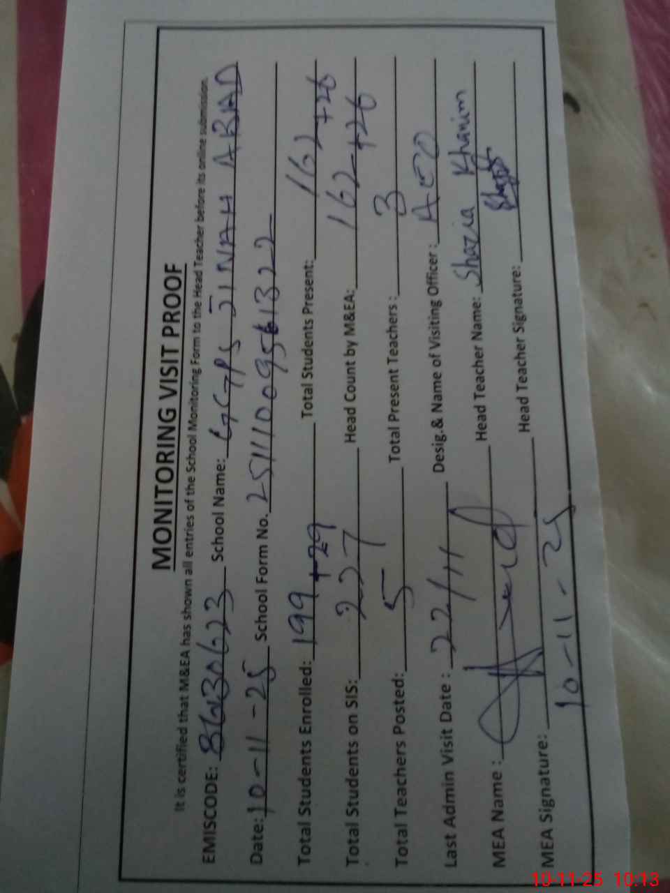 | Attendance Register | Head Teacher | MEA with School | Visit Proof |
