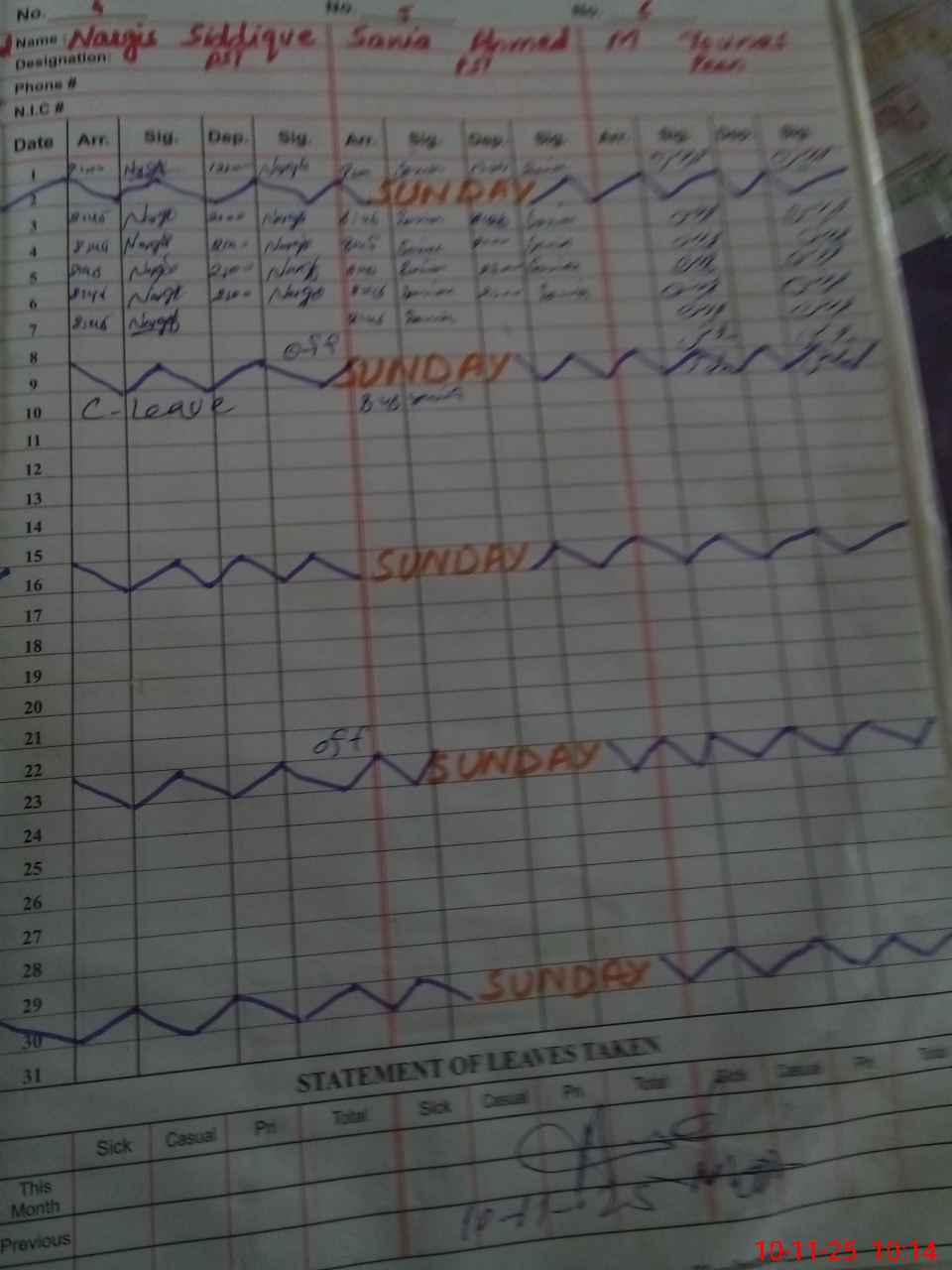 | CNIC | Full Name | Designation | R/C | Absence During Last Calender Month |