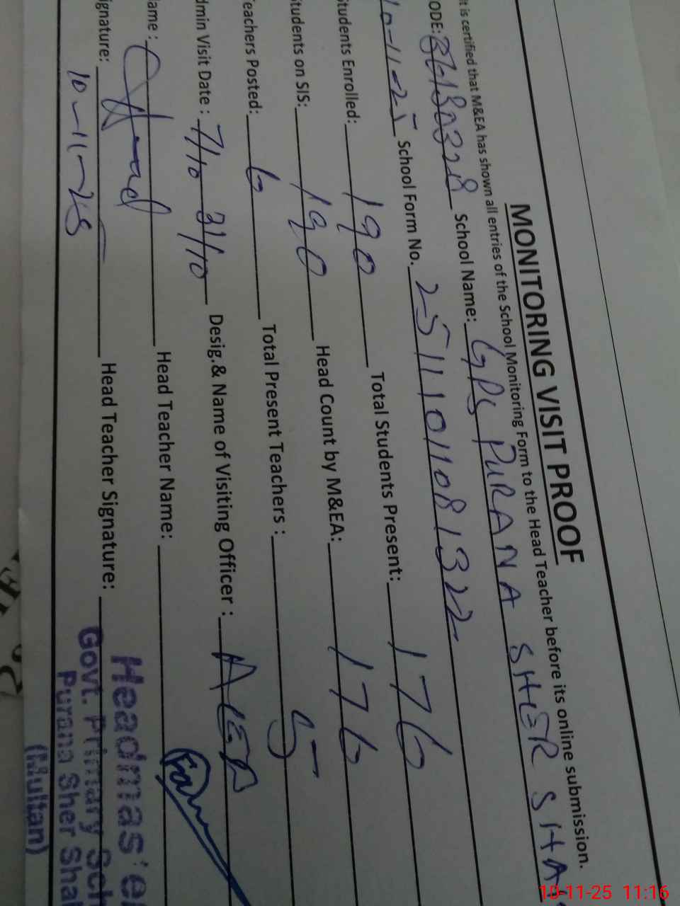| EMIS Code: 36130328 | Name of School: GPS PURANA SHER SHAH MULTAN | |||
