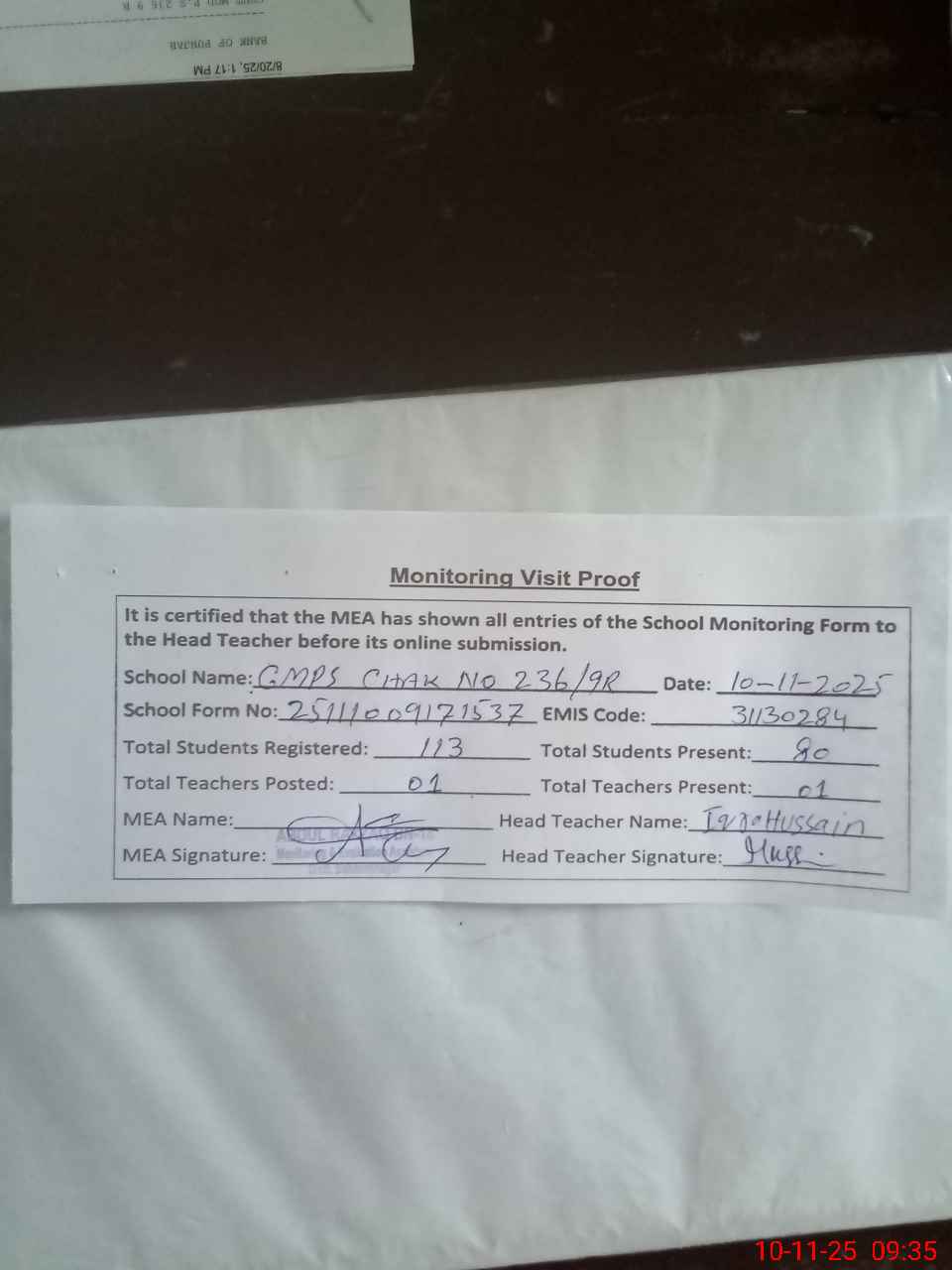 | Attendance Register | Head Teacher | MEA with School | Visit Proof |