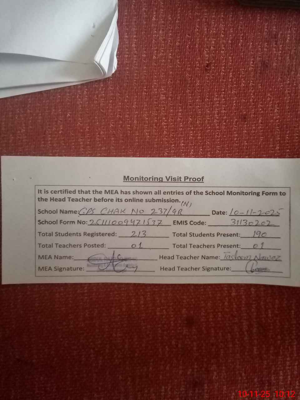 | EMIS Code: 31130202 | Name of School: GPS CHAK NO. 237/9-R NORTH | |||
