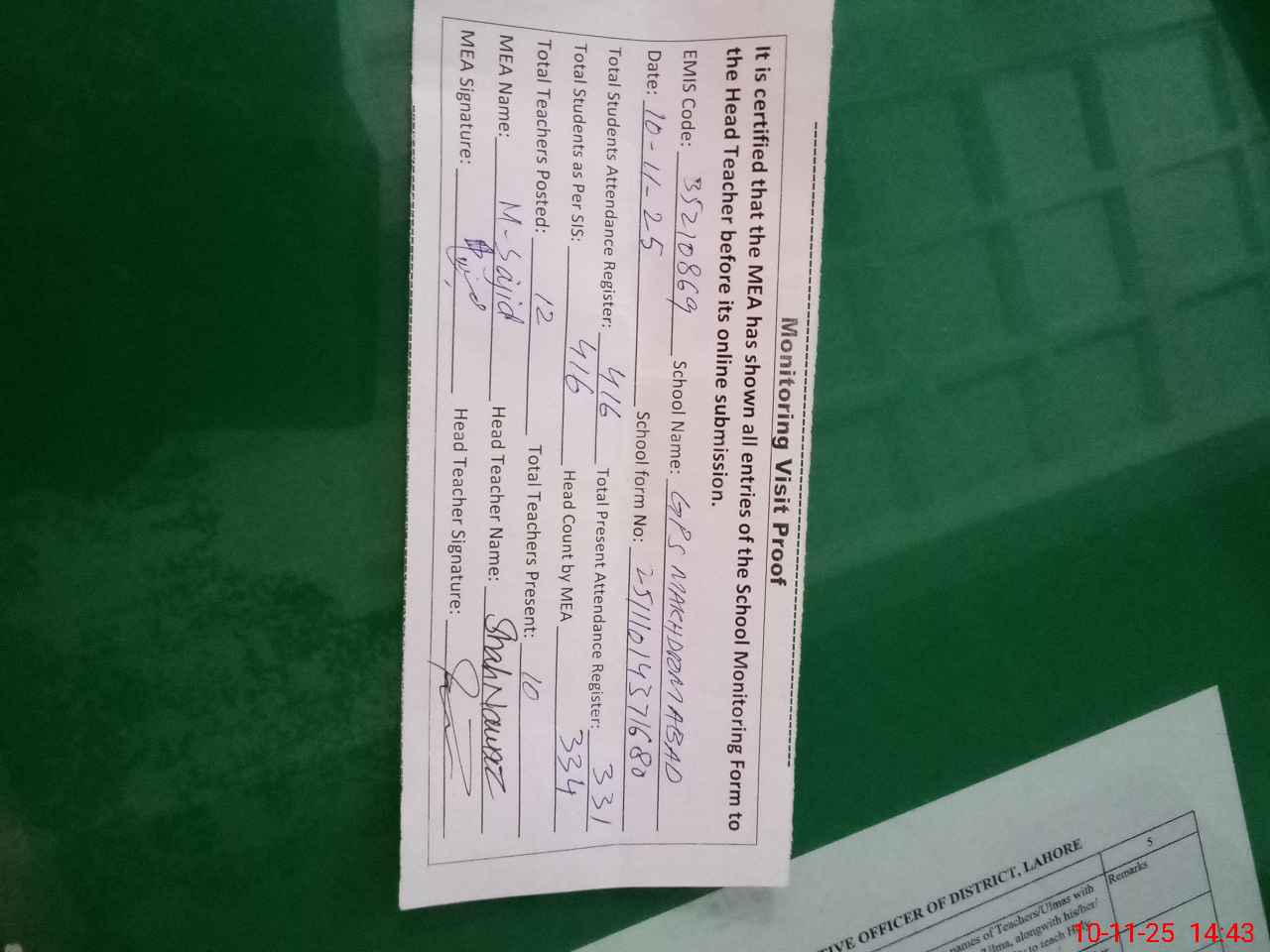 | Remarks (Use Separate Page if Required): AEO visited this school on 28 Oct 2025 Total sanctioned posts of teacher 12 FTF bank statements are not available after July 2025 Present students percentage is 80 percent 35210869 | |||||