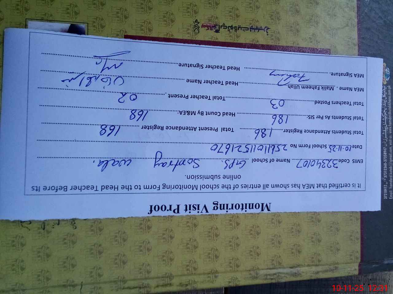 | Attendance Register | Head Teacher | MEA with School | Visit Proof |