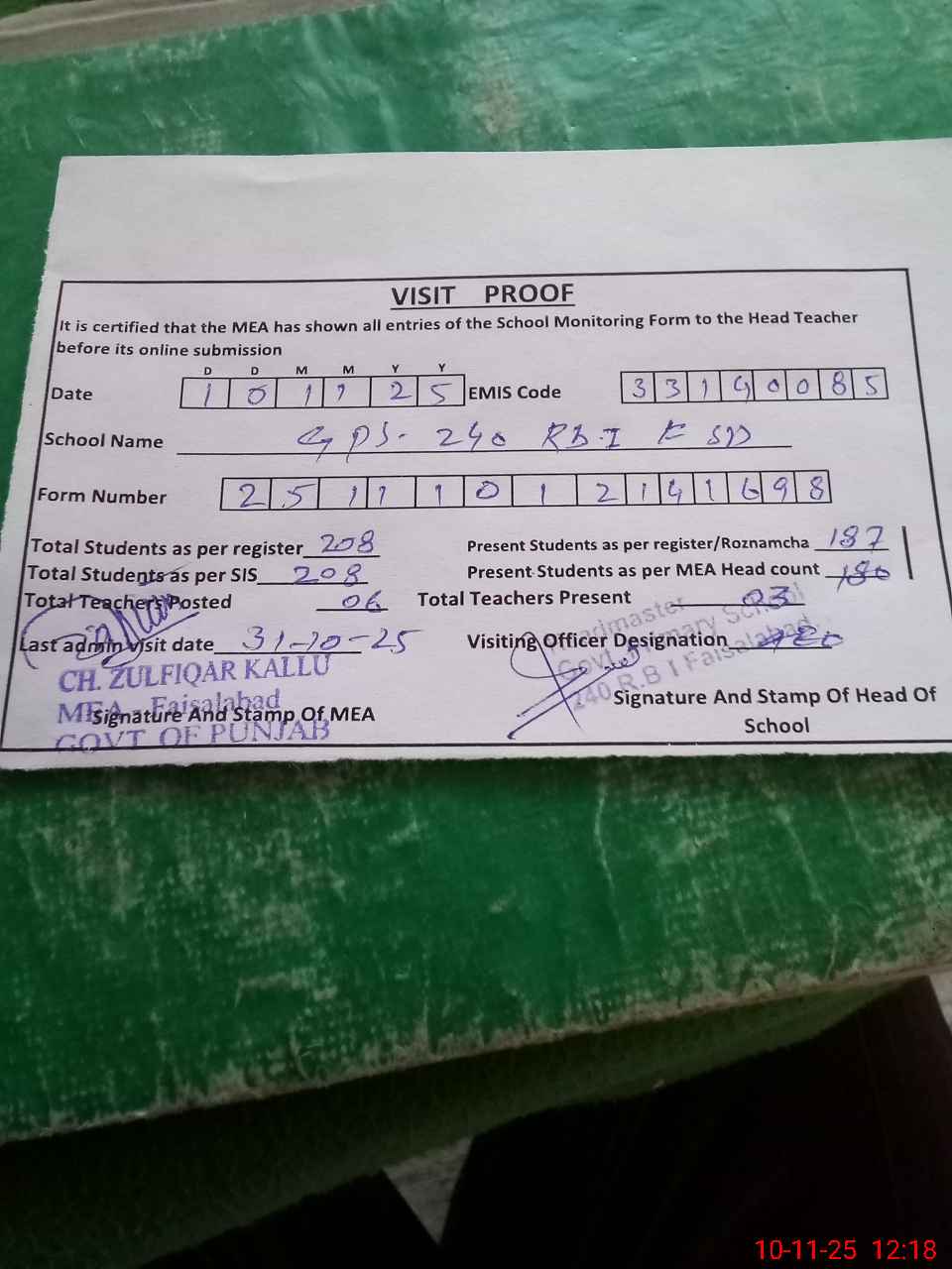 | Attendance Register | Head Teacher | MEA with School | Visit Proof |