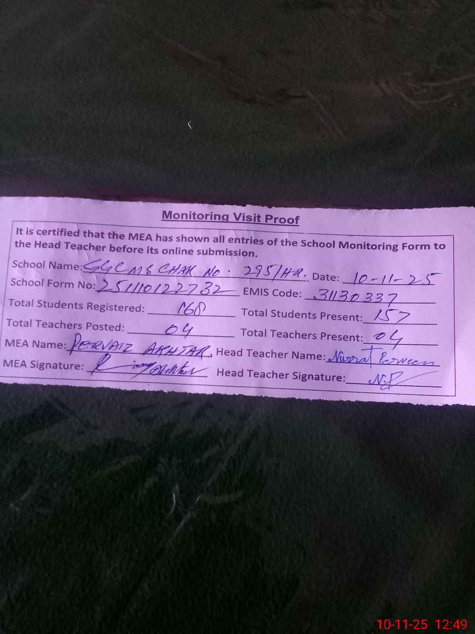 | EMIS Code: 31130337 | Name of School: GGCMS CHAK NO. 295 HR | |||
