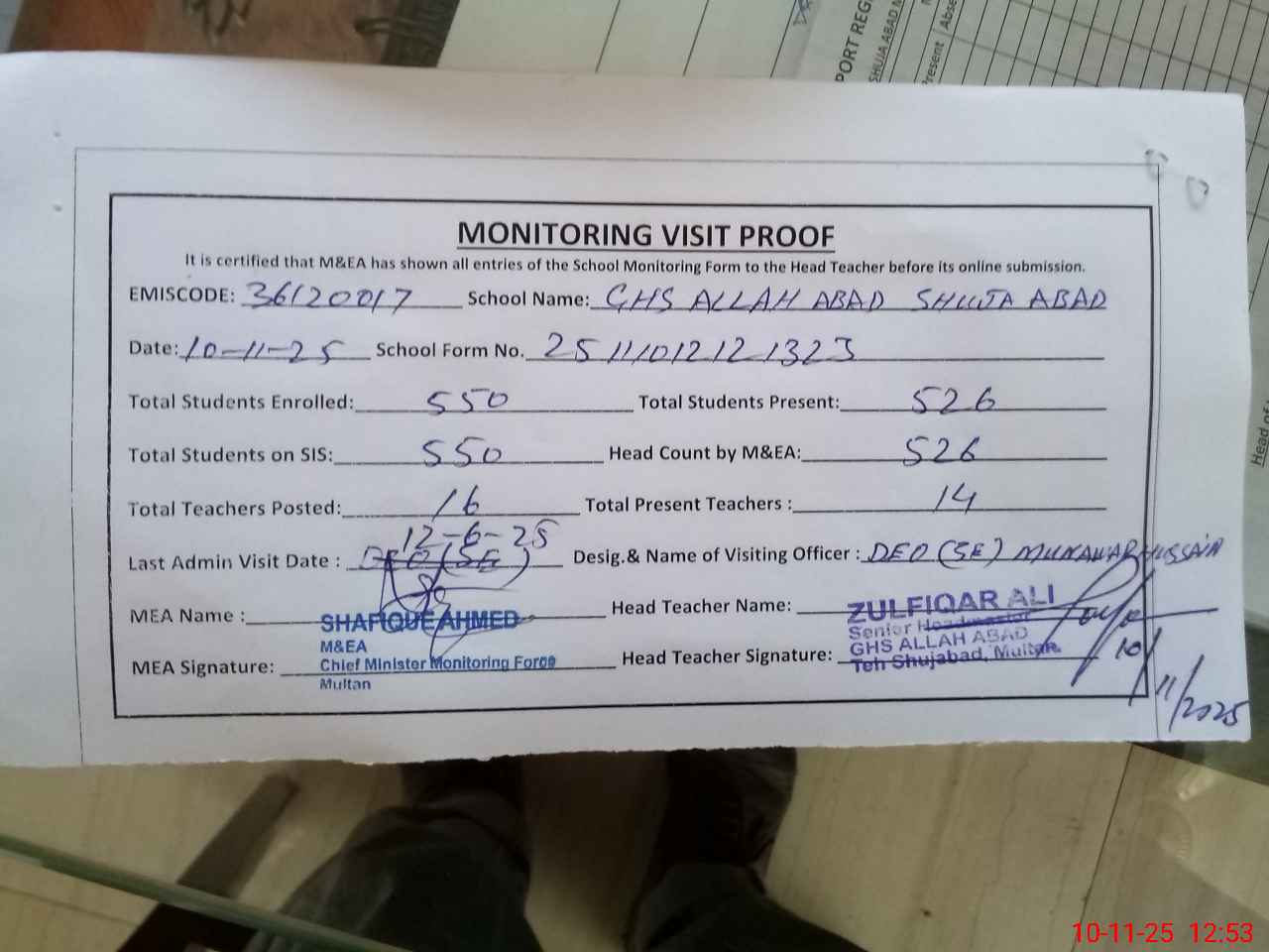 | EMIS Code: 36120017 | Name of School: GHS ALLAH ABAD SHUJABAD | |||