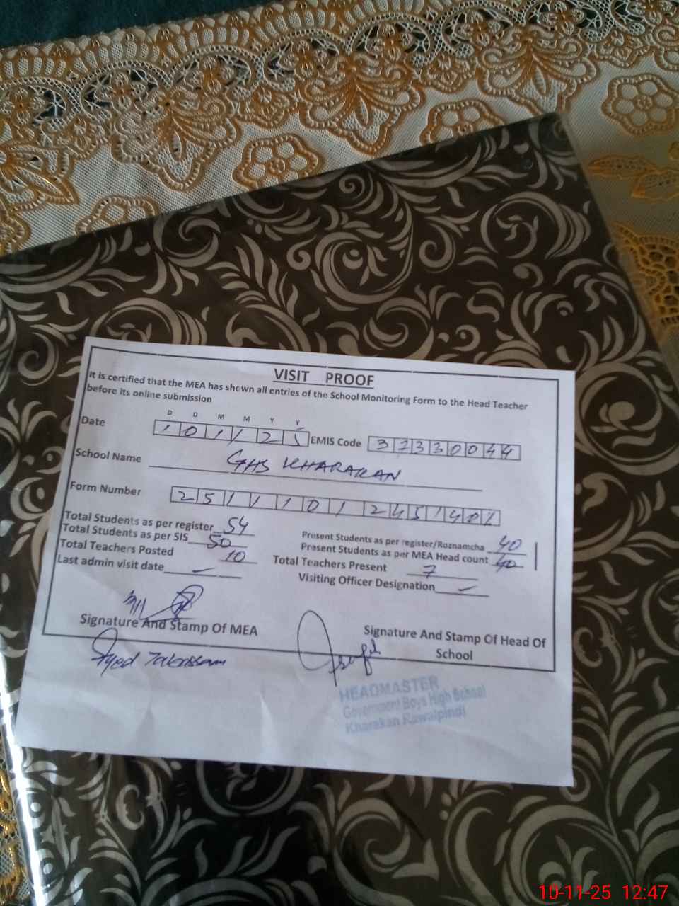 | Certified that this School was Inspected by the Undersigned MEA/DMO Today and the Information Stated Above is as Per Record. | |||||