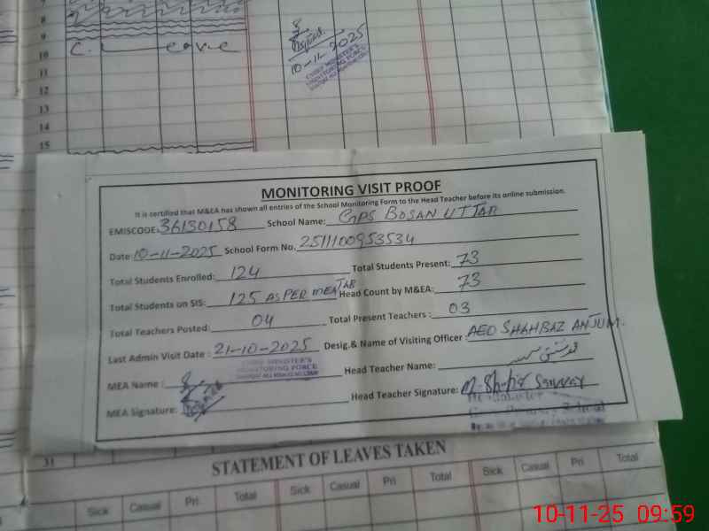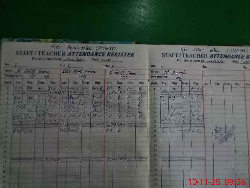 | Total no. of Classrooms: 4 No. of Classrooms Used for Teaching: 4 No. of Classrooms Storing Old Furniture, FTBs, etc: 0Comments if Any: Random students ATTENDENCE in MEA TAB of class 3 is not correct two students are in kachi banoodaughter of ramzan and abeera daughter of imran and two students are in 2 class Bilal son of NAWAZ Faisal son of m iqbal School tab sis not opening due to sign |