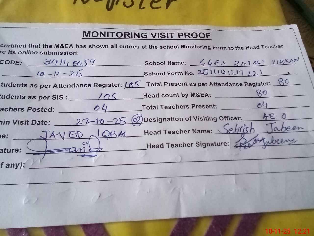 | Attendance Register | Head Teacher | MEA with School | Visit Proof |