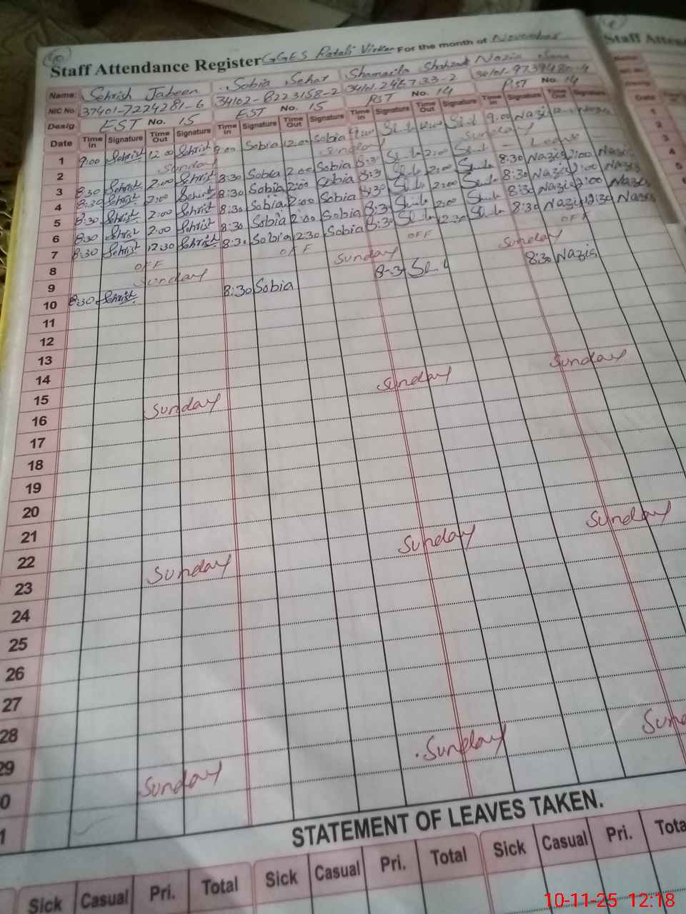 | CNIC | Full Name | Designation | R/C | Absence During Last Calender Month |