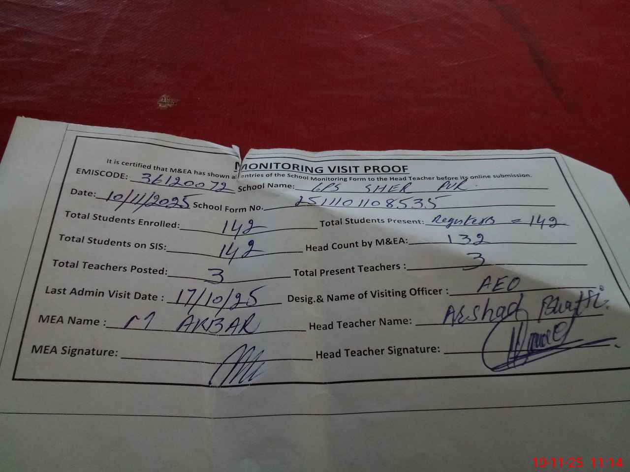 | Attendance Register | Head Teacher | MEA with School | Visit Proof |