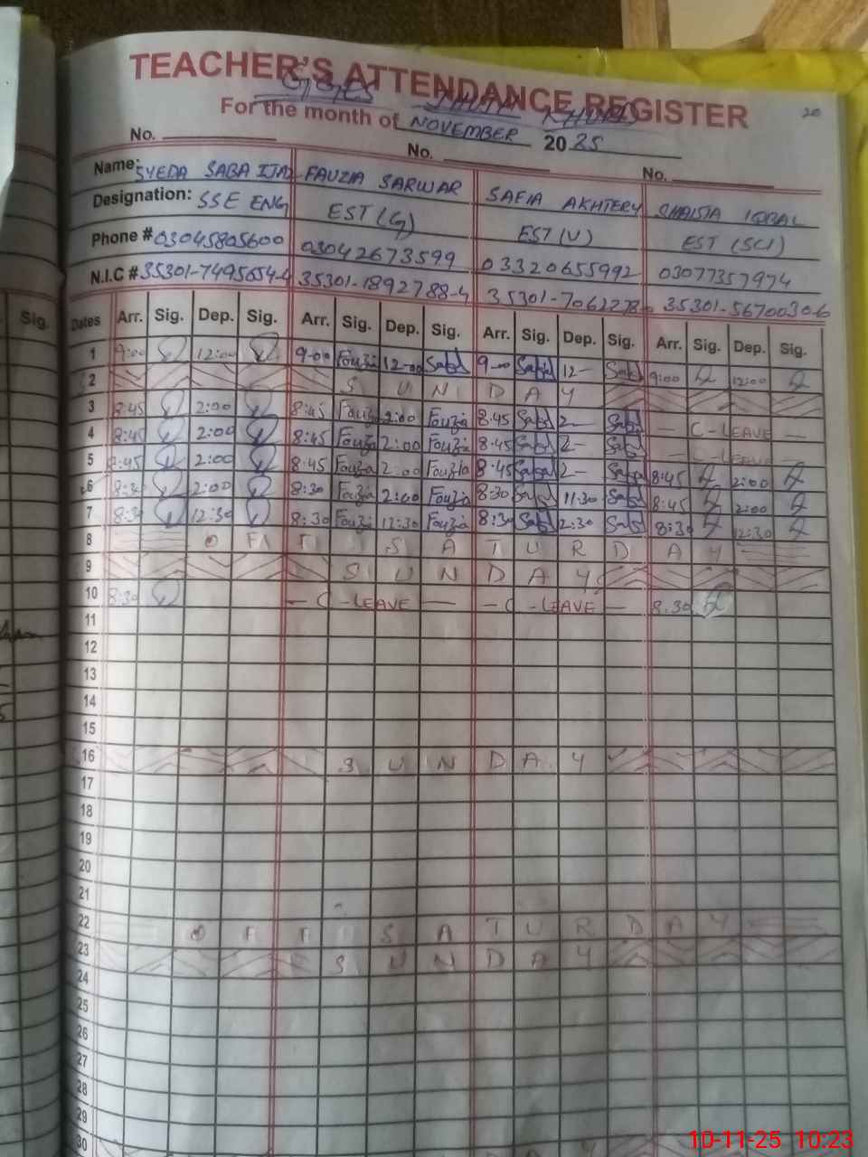 | 35**** | Na**** | NAIB QASID | Regular | 1 | 0 | 0 | 0 | 0 | 0 | 0 | 0 | 1 | Casual |