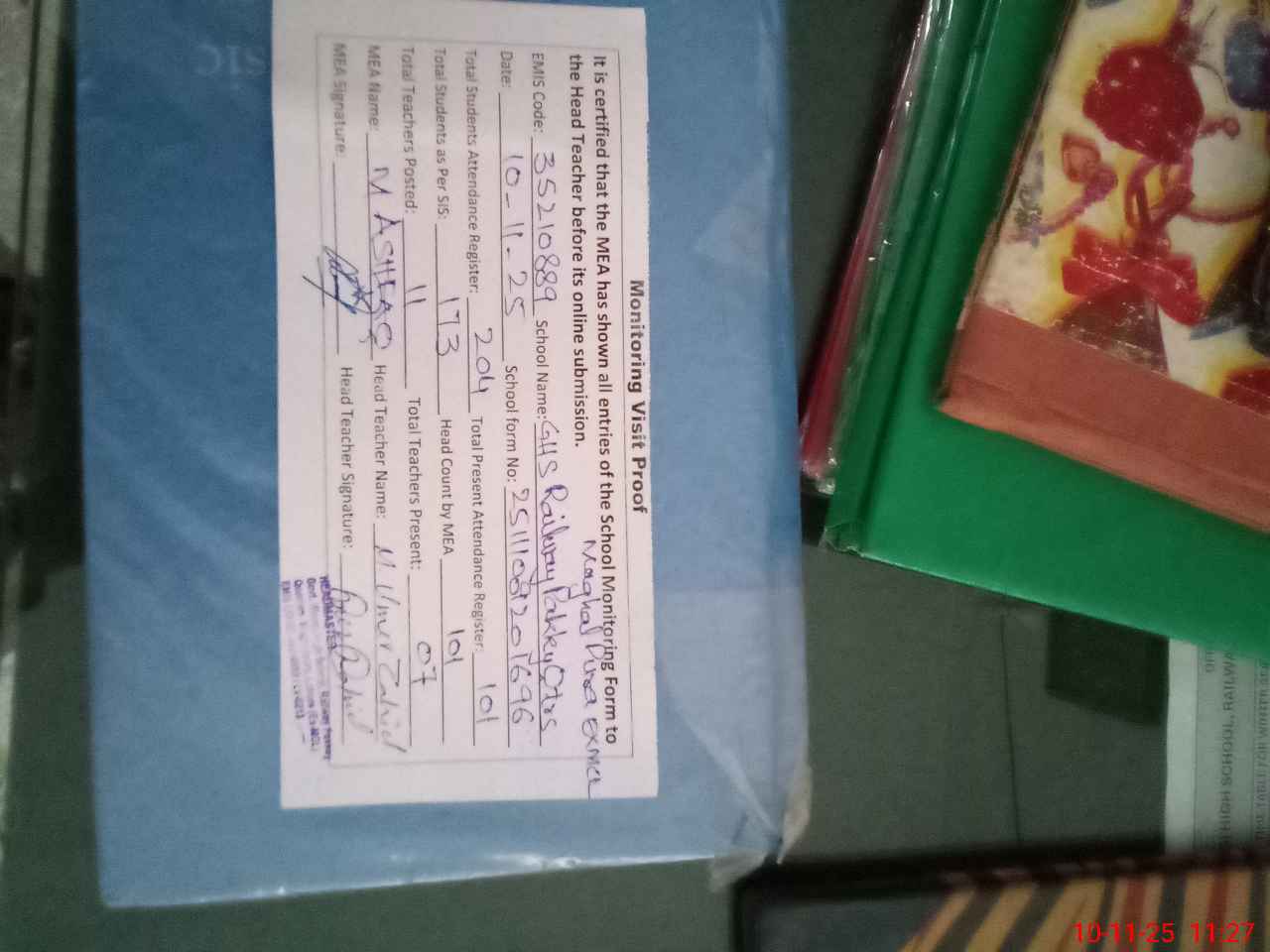 | Attendance Register | Head Teacher | MEA with School | Visit Proof |