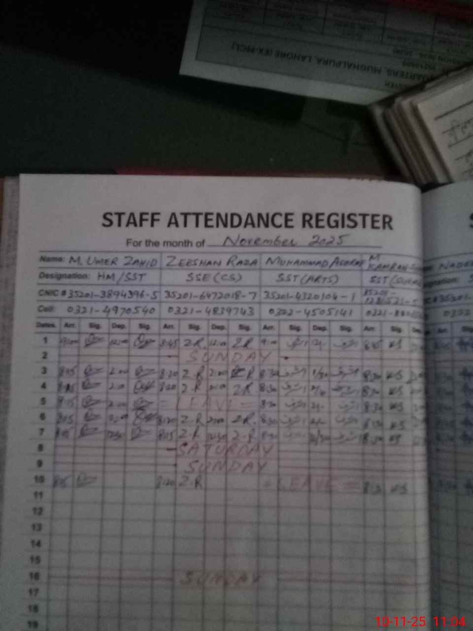 | CNIC | Full Name | Designation | R/C | Absence During Last Calender Month |