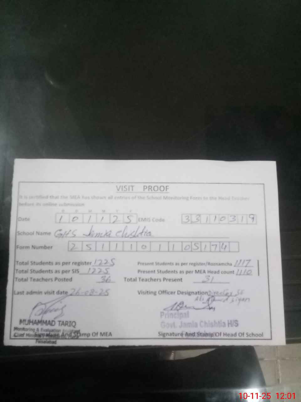 | Attendance Register | Head Teacher | MEA with School | Visit Proof |