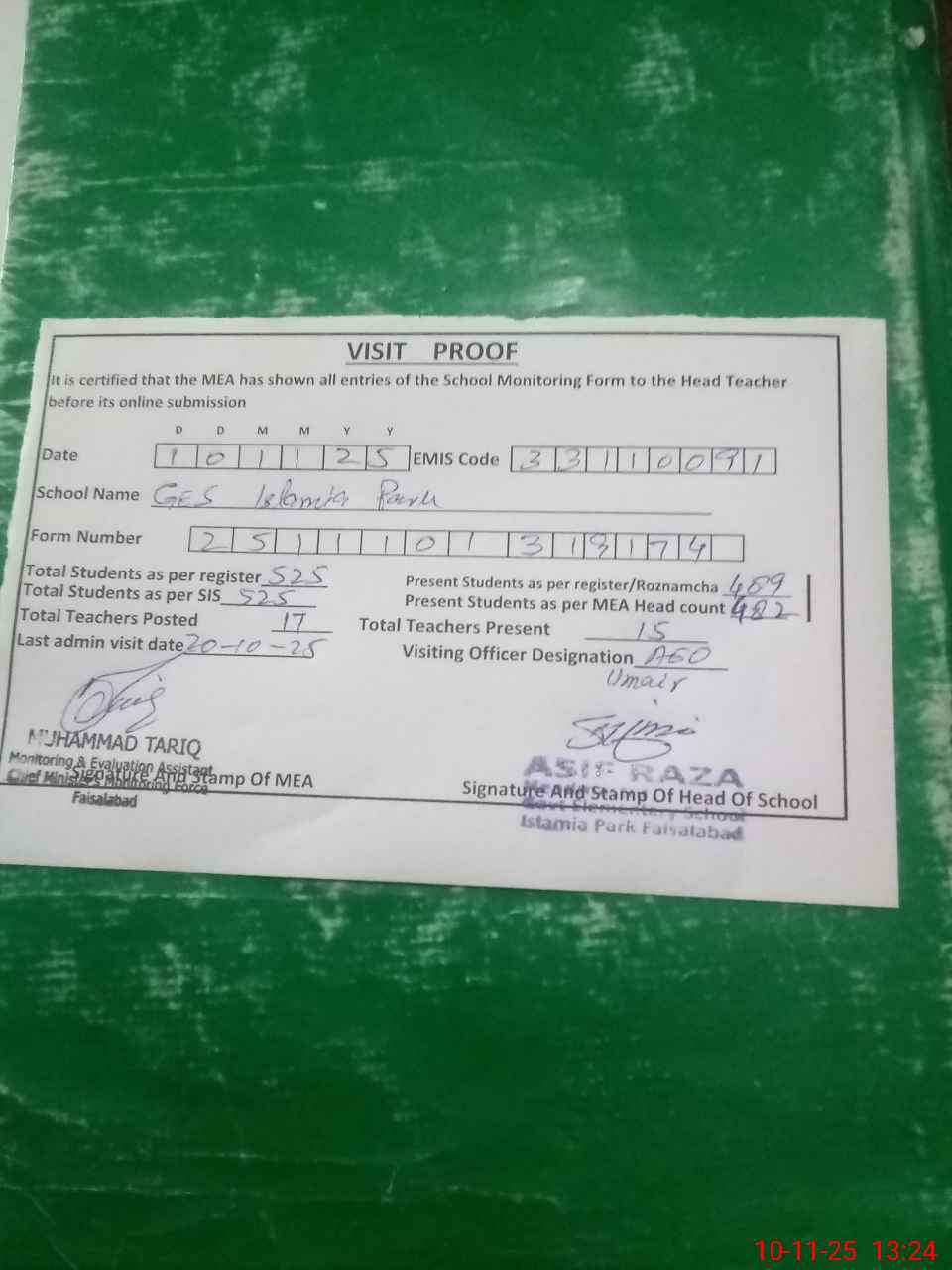 | EMIS Code: 33110091 | Name of School: GES ISLAMIA PARK FSD | |||