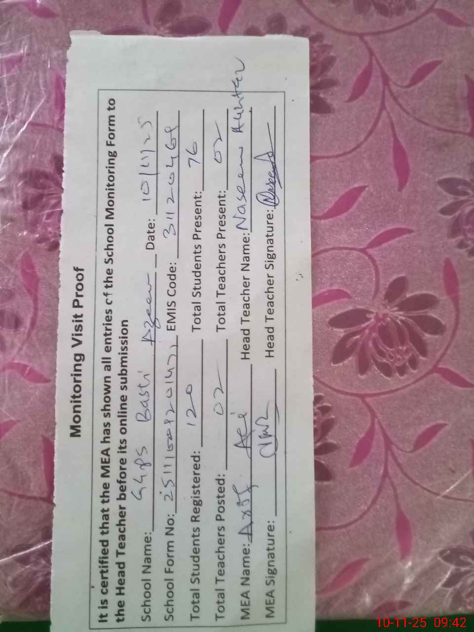 | Attendance Register | Head Teacher | MEA with School | Visit Proof |