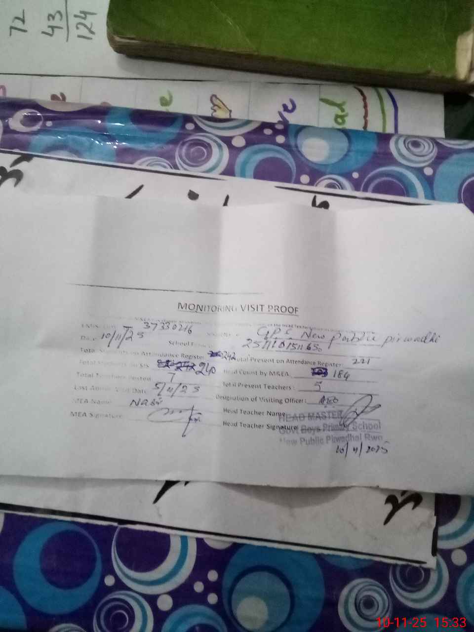 | Attendance Register | Head Teacher | MEA with School | Visit Proof |