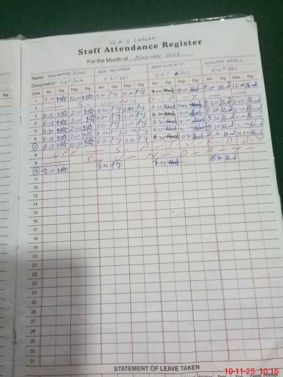 | Leave | Duty | Absent | Maternity | Medical | Ex- Pak |