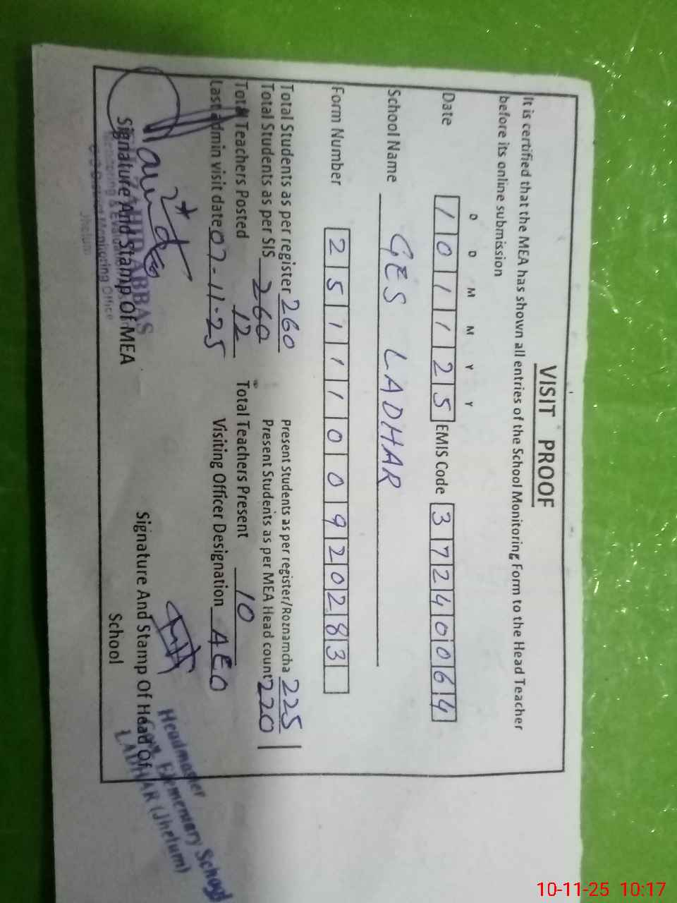 | Certified that this School was Inspected by the Undersigned MEA/DMO Today and the Information Stated Above is as Per Record. | |||||