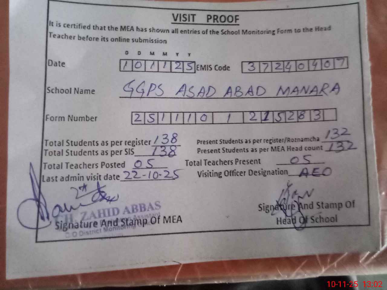 | EMIS Code: 37240407 | Name of School: GGPS ASAD ABAD MANARA | |||