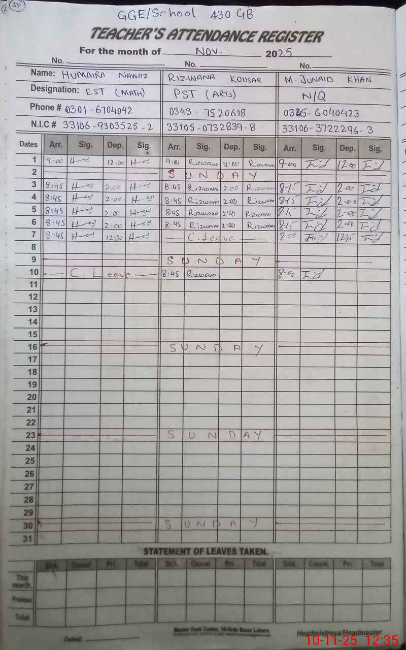 | Name: HU**** NA**** Designation: (School Headmaster's/Headmistress's) EST (MATH ) Phone/Cell Number: 03**** |