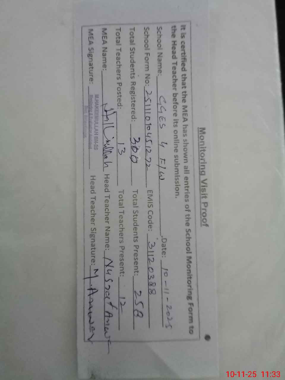 | EMIS Code: 31120388 | Name of School: GGES CHAK NO. 4/FW | |||