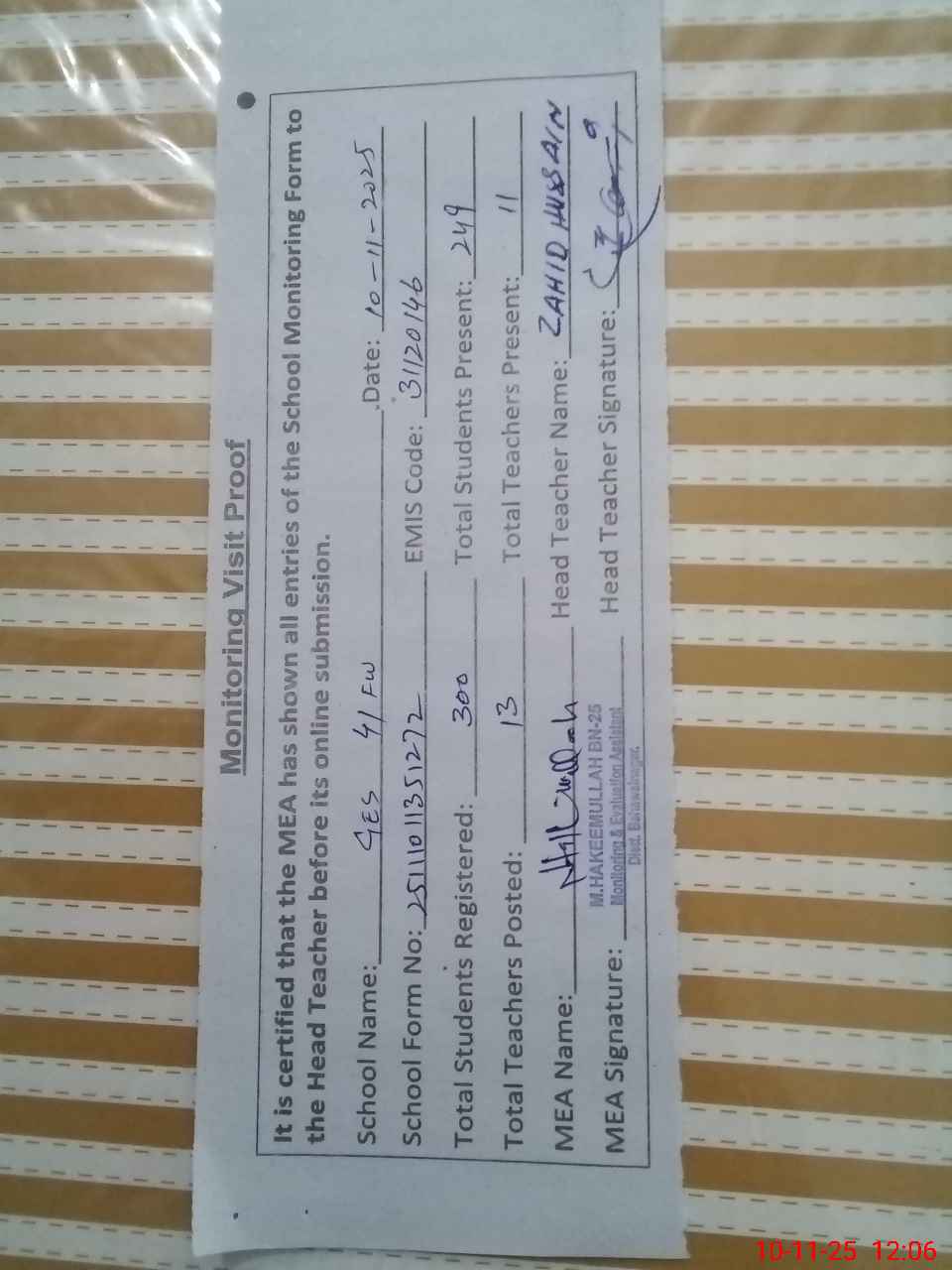 | Monitoring Date: 10-11-2025 | Start Time: 10-11-2025 11:35 AM | End Time: 10-11-2025 12:08 PM | Name of MEA: Mu**** ha**** ul**** BN25 | |