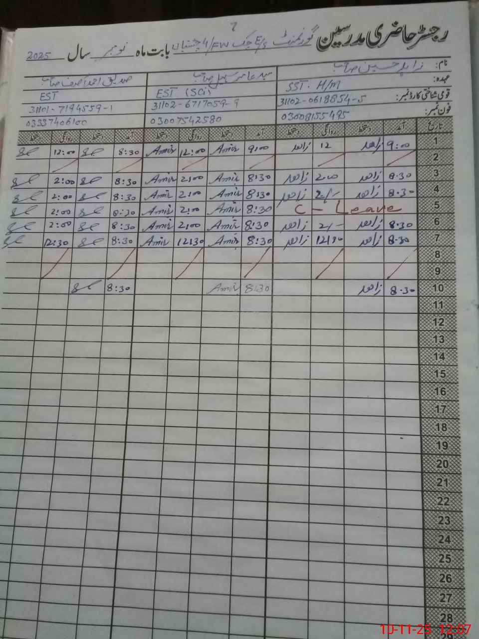 | CNIC | Full Name | Designation | R/C | Absence During Last Calender Month |