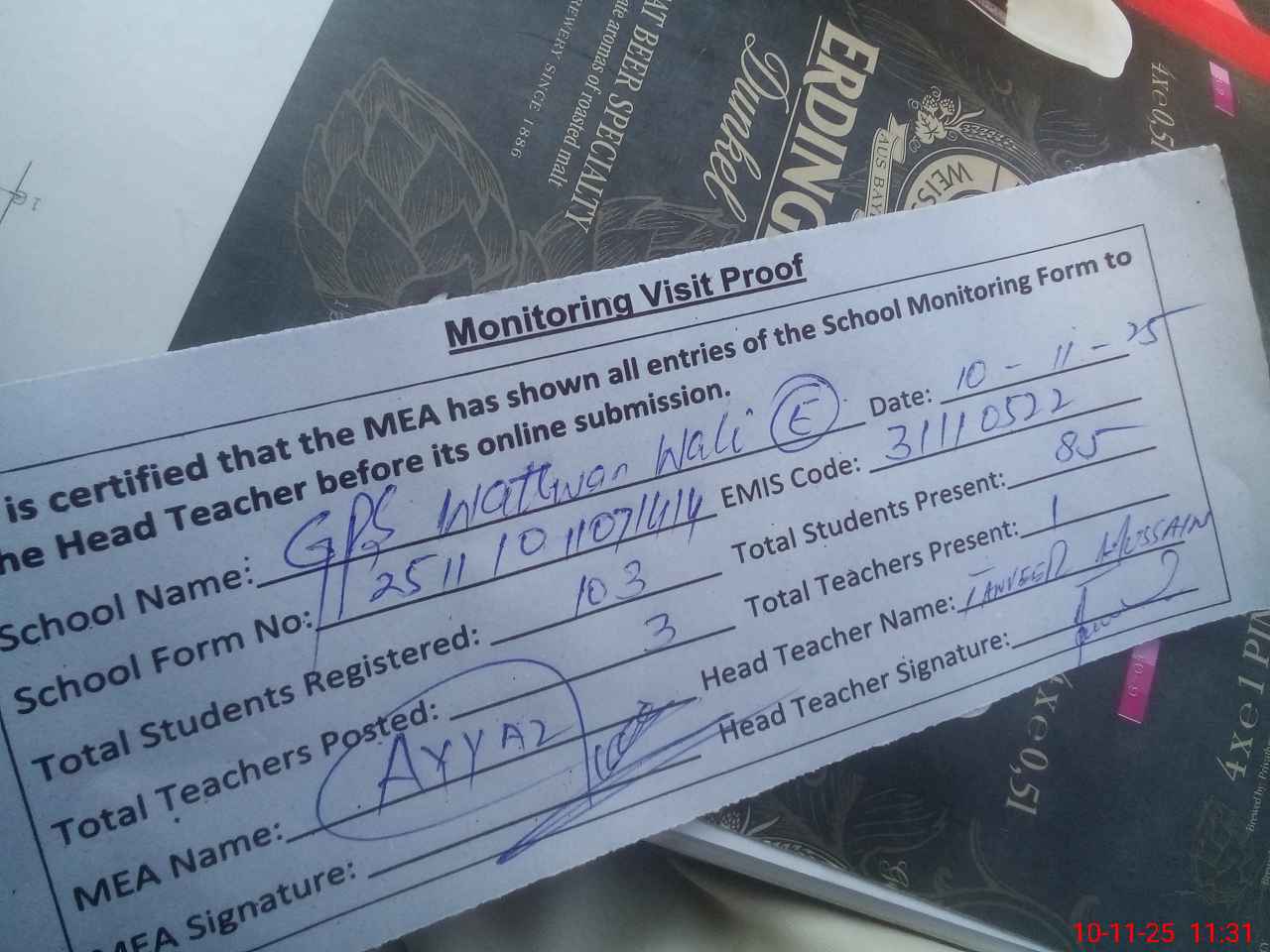 | Attendance Register | Head Teacher | MEA with School | Visit Proof |