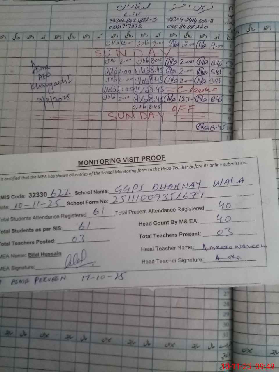 | Attendance Register | Head Teacher | MEA with School | Visit Proof |