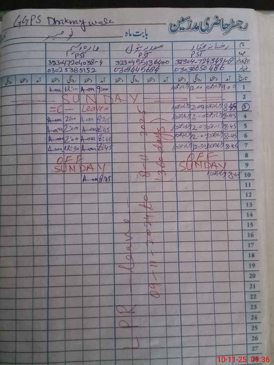 | CNIC | Full Name | Designation | R/C | Absence During Last Calender Month |