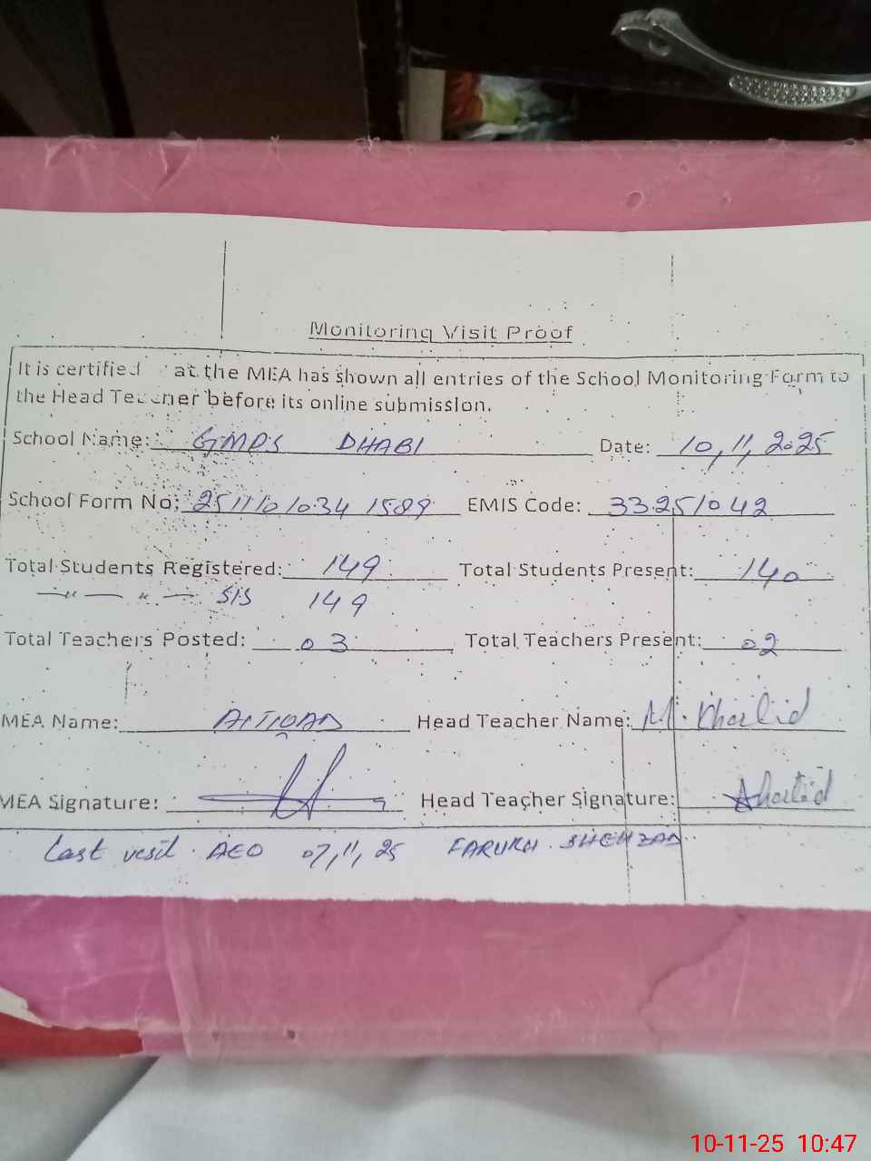 | Attendance Register | Head Teacher | MEA with School | Visit Proof |
