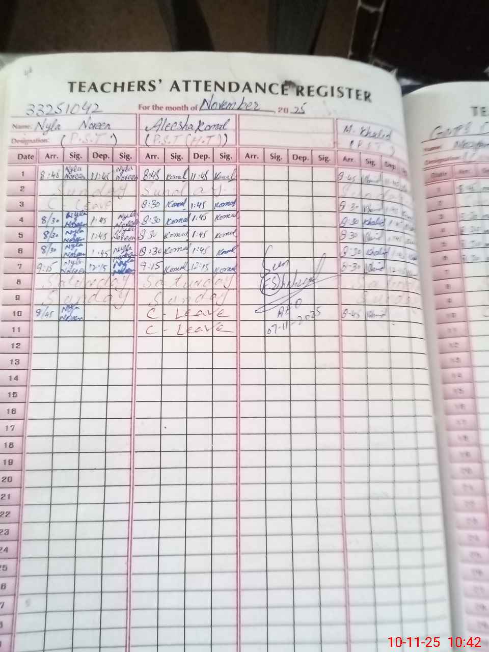 | CNIC | Full Name | Designation | R/C | Absence During Last Calender Month |