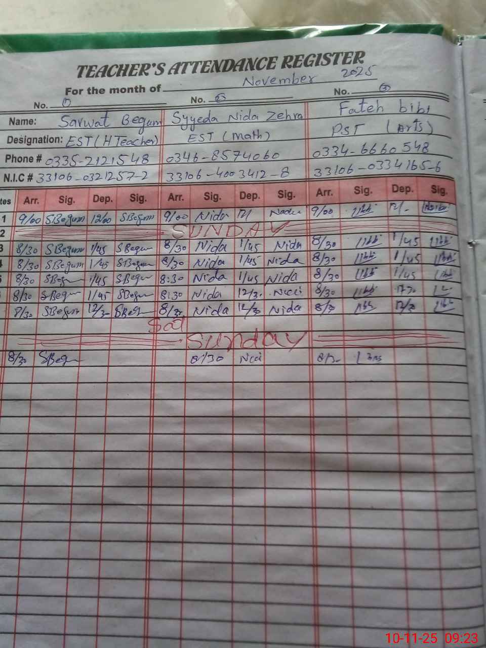 | CNIC | Full Name | Designation | R/C | Absence During Last Calender Month |