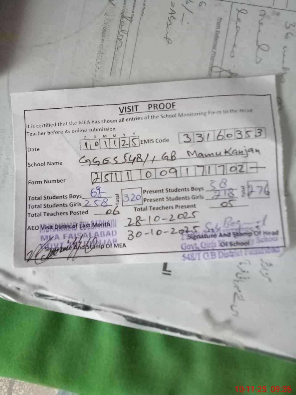 | Monitoring Date: 10-11-2025 | Start Time: 10-11-2025 09:00 AM | End Time: 10-11-2025 09:36 AM | Name of MEA: MU**** ZU**** | |