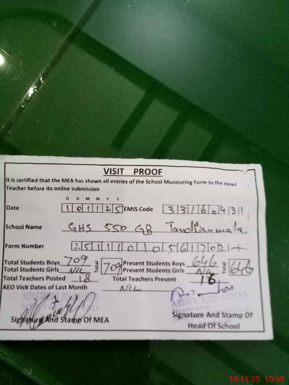 | Certified that this School was Inspected by the Undersigned MEA/DMO Today and the Information Stated Above is as Per Record. | |||||