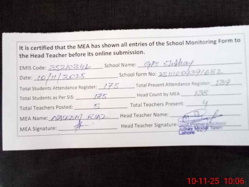 | Attendance Register | Head Teacher | MEA with School | Visit Proof |