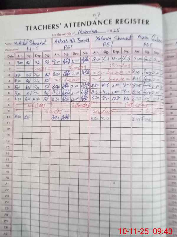| Remarks (Use Separate Page if Required): Chowkidar Hafiz Sharafat Ali reportedly on Polio Duty but no written record available so marked him absent Floor of the building has caved in and potentially dangerous | |||||